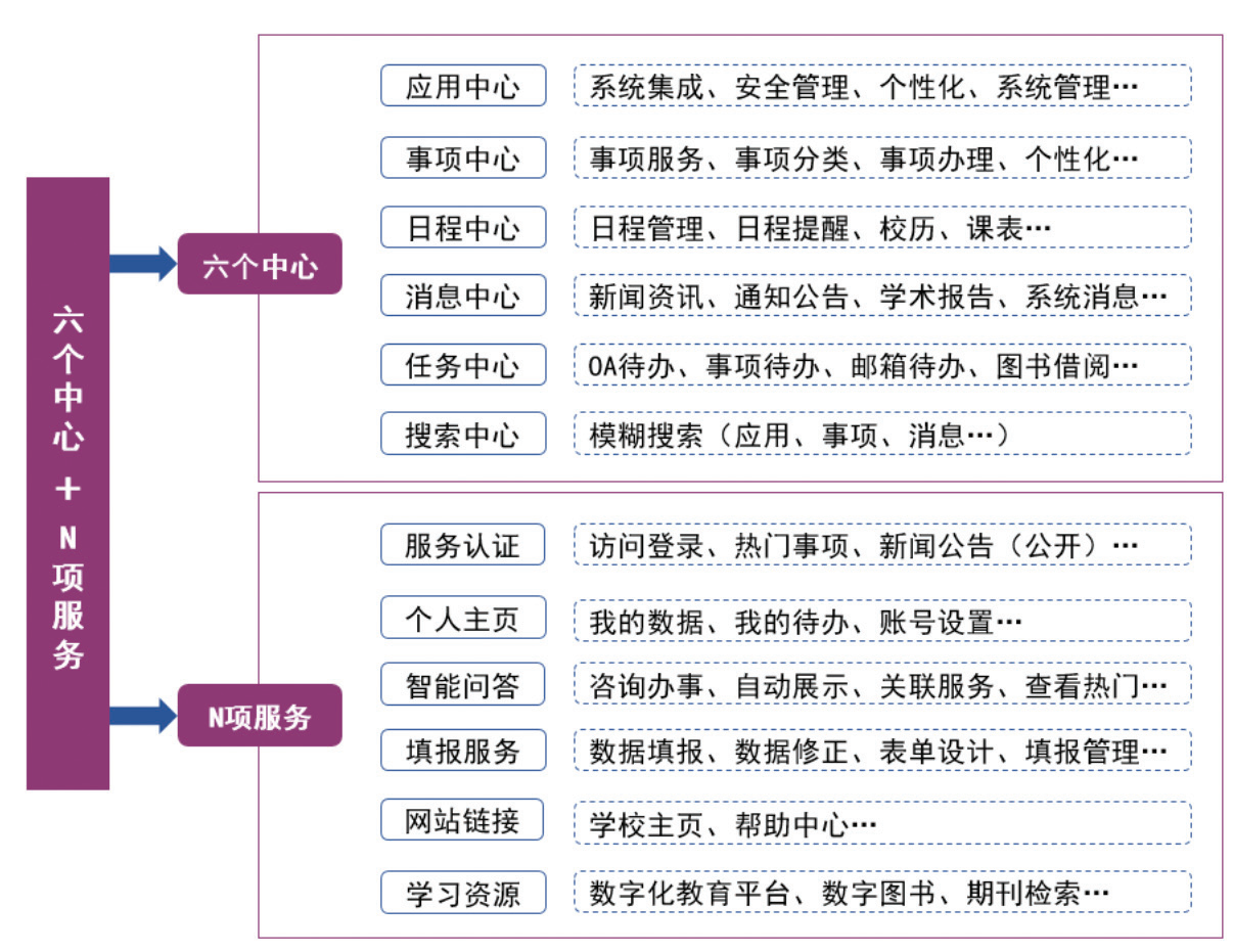 应用支撑。应用是融合门户实现融合的信息和系统来源,包括人、财、物、办公以及学习相关,例如办事大厅、教学管理信息系统、研究生信息管理系统、人力资源管理平台、办公自动化系统、学院/部处网站、信息填报系统等。