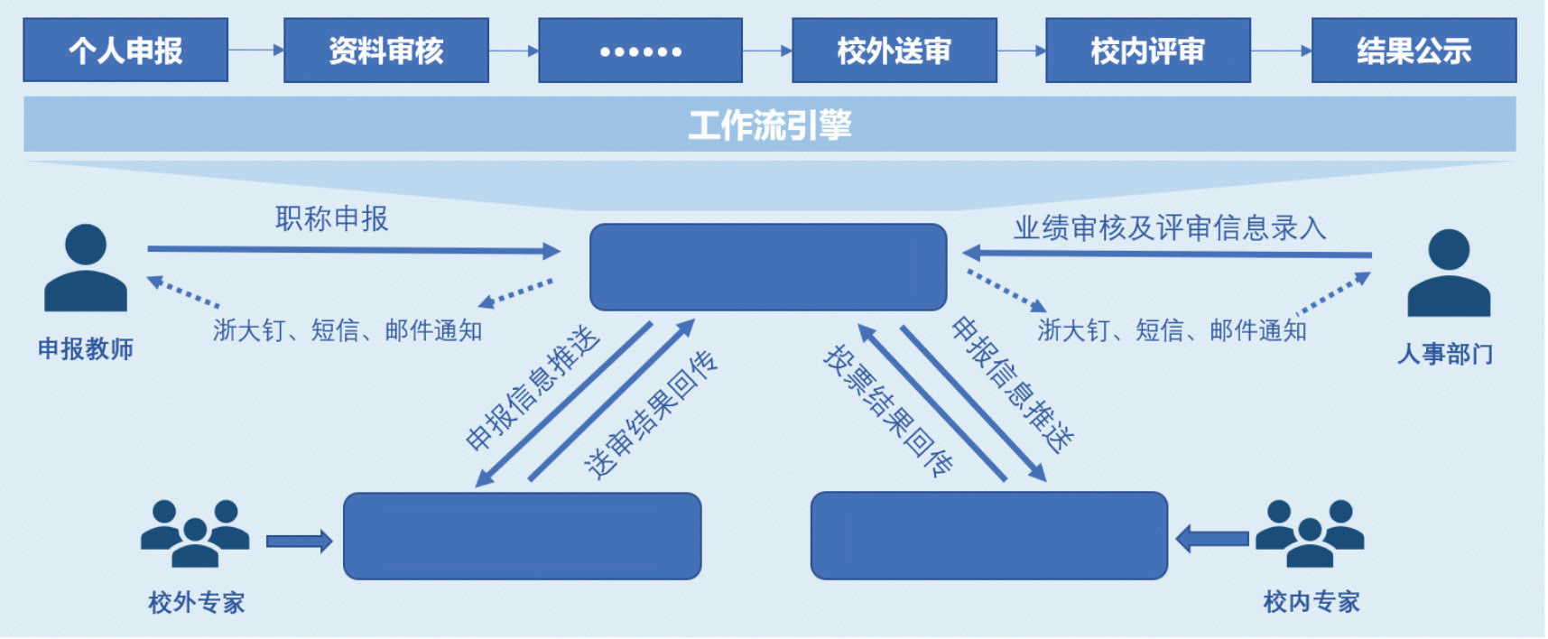 根据职称评聘工作系列多、流程长、响应要求高的特点,学校通过多种技术措施相结合,进一步加强了业务流程间的紧密协同。一是基于工作流引擎,构建人事管理系统的流程管控体系,支撑业务流程的自定义搭建与审核环节角色及权限的灵活指派,从而快速响应不同系列职称评审流程的定制化需求。二是借助学校消息平台能力,打通浙大钉、短信、邮件通知等多样式消息提醒功能,加速业务流程审核。三是基于评聘数据的跨域流通,实现了人事管理系统、校外送审系统、评审投票系统三大人事业务系统的流程协同,改变了以人工分批次导入来串联不同业务系统的窘境。