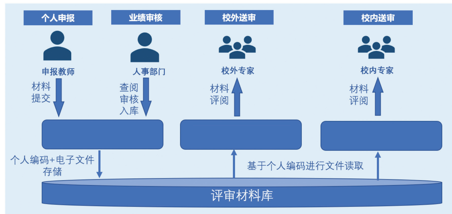 如图4所示,评审材料电子化管理面向多角色用户提供服务,解决教师业绩材料的线下提交、线下管理、线下评阅的局限性。面向申报人,模块提供了教师上传并管理个人代表作、论文、著作、专利等电子版业绩材料的入口,并在材料被提交后基于申报系列、职务及所在单位等信息为申报人生成个人专属编码,直接替代了原有提交纸质材料的低效模式。面向人事部门,模块在审核过程中支持人事部门对相关业务材料的查阅、编辑及向申报人发起文件补充邀请,在审核结束后自动将带有个人编码信息的支撑材料推送至评审材料库,在评审结束后可按材料编码分批对相关电子材料进行备份存档或销毁,大幅减少了人事部门在全校申报人材料汇总、整理上的巨大工作量。面向评审专家,模块一方面支持评审材料的在线预览与批注,提高了材料评阅工作的便利性,另一方面通过专家权限的分配和控制,提升了评审材料的安全保密性。