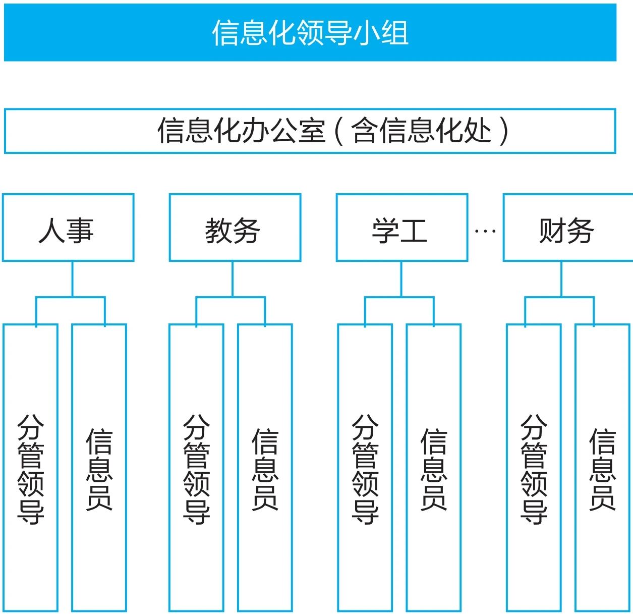 信息化队伍分为三层结构,自顶向下依次为学校信息化领导小组、信息化办公室、二级单位信息化队伍。图1为对外经济贸易大学信息化队伍组织架构。