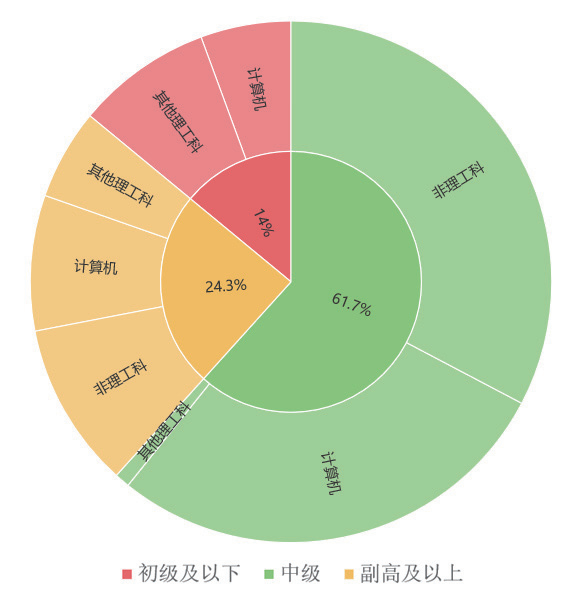 对校内信息化工作人员的学科背景进行分析,如果人员在学历培养中,所学专业的培养方案包含计算机相关课程,视同具有计算机相关背景。结果显示,校内信息化人才队伍中仅有不足50%的人员具有计算机相关背景。非计算机相关背景人员主要集中在兼职人员队伍中,且比例大于70%。