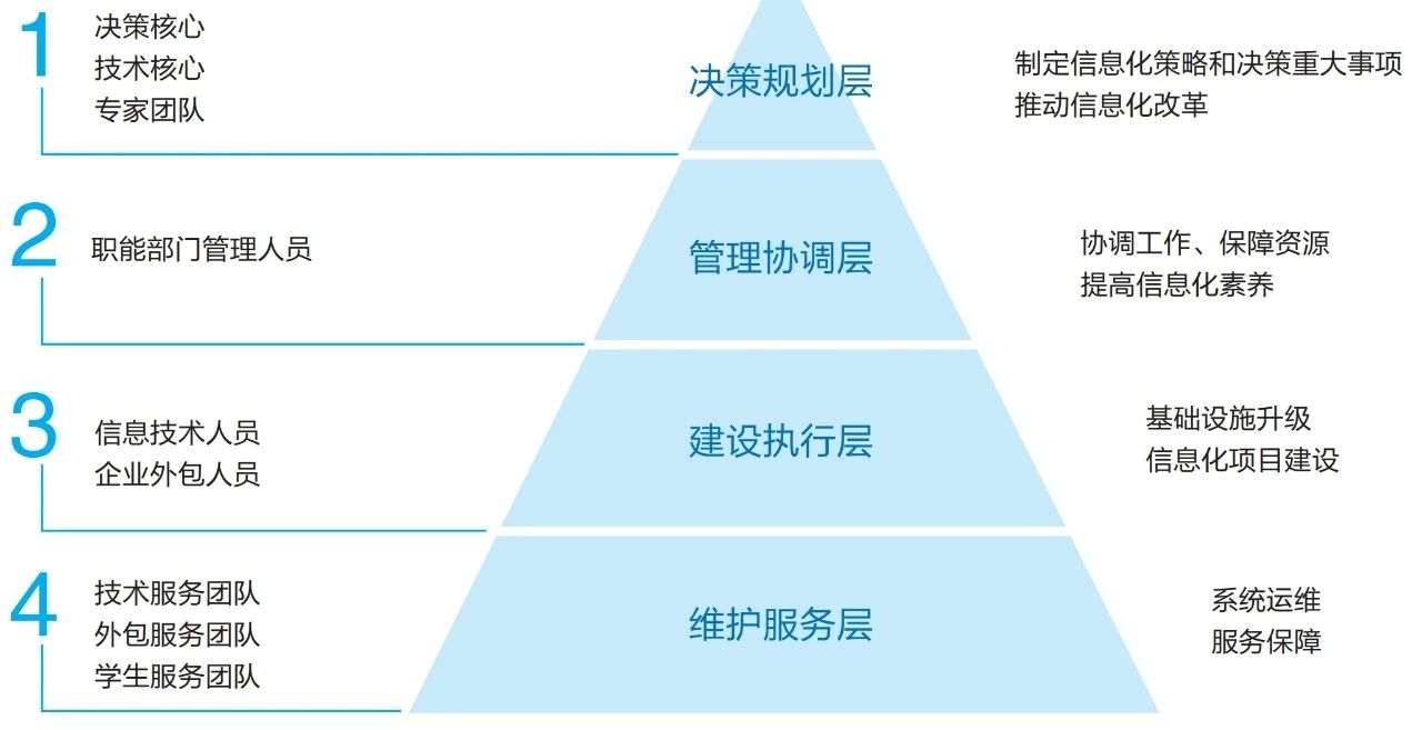信息化人才队伍主要由决策规划层、管理协调层、建设执行层和维护服务层这四类人员层次构成。