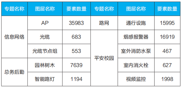 在专题图层管理方面,学校推进从人、空间和活动三个维度,将学生、人事、资产、教学、科研、实验室、交通、安防、消防、后勤园林等各类管理信息系统的数据与“一张图”平台进行对接,实现高度集成、融合和联动。学校已基于网络与计算中心、保卫处、国有资产管理办公室、实验室与设备管理处、校医院等单位的业务需求,建设了信息网络、平安校园、校园资产、绿色校园、健康校园等一系列的专题应用,管理图层达到129个,管理要素超过10万个。表2为华中科技大学专题图层管理统计。