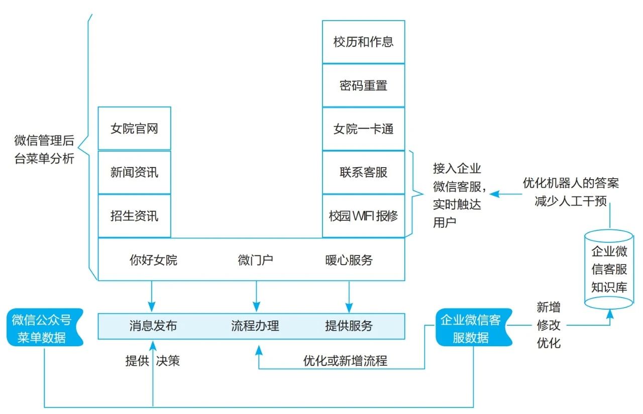 基于以上调研结果和问题分析,本文认为高校应当以用户为中心,以简便快捷的方式满足师生的需求。因此,本文提出在微信平台上整合校内业务并接入企业微信客服,从而构建一个人工与知识库相结合的便捷交互和实时触达的校园移动微门户。
