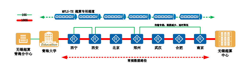 在为青海大学校园网扩容后,赛尔网络公司积极关注无锡超算中心青海大学分中心的网络服务进展。日前,为有效提升青海大学超算传输速率,公司网络运行保障团队联合启动优先级的通信保障方案,经过反复设计测试降低网络延时并减少路由跳数,为该超算业务开通一条郑州直达南京的10Gbps线路,并在此基础上架构“西宁至南京”的MPLS-TE算力业务专线通道,显著提高了无锡超算中心至青海大学分中心超算业务的数据传输效率。