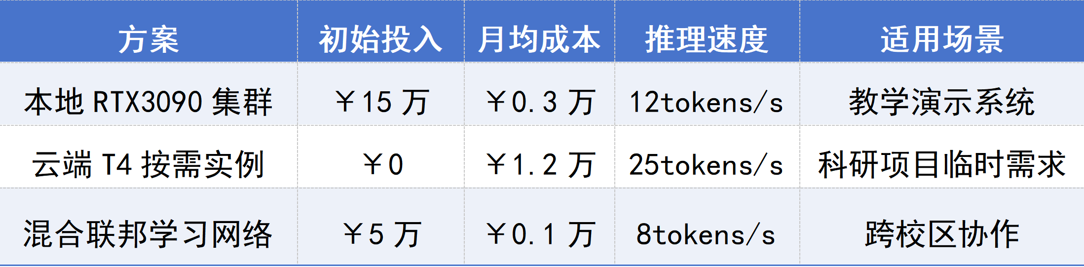 混合联邦方案以折中的5万初始投入和最低月费(0.1万),通过8tokens/s的协作效率满足跨校区场景需求。
