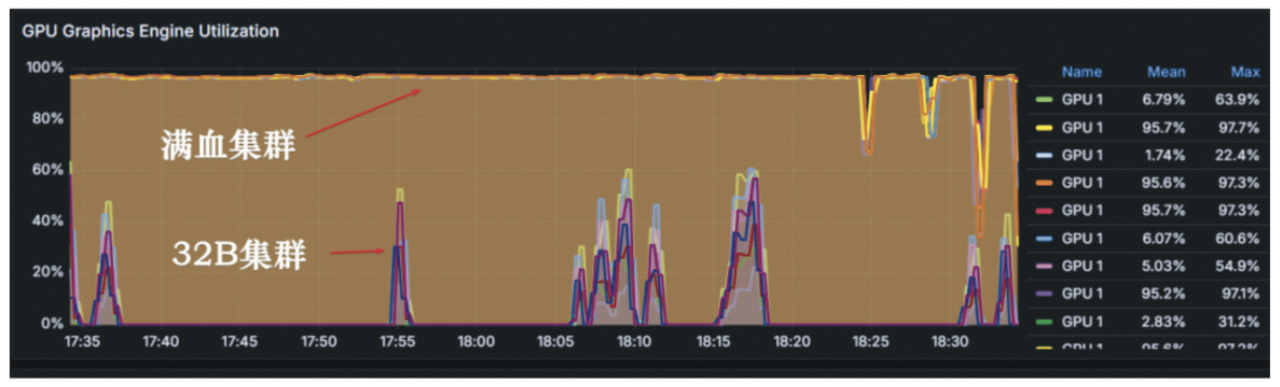 图1 GPU集群利用率动态分析:32B与满血集群性能对比