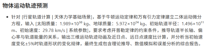 以物理天文为例,若要协助计算行星轨道,一般人能想到的常规提示词大致是:“已知太阳质量:1.989x1030kg、地球质量:5.972x1024kg,帮我计算轨道半长轴、偏心率与轨道能量的关系。”而经过学生团队探索,设计出了专业的结构化提示词,加入了“针对行星轨道计算天体力学基础场景”“基于牛顿运动定律和万有引力定律建立二体运动微方程”等条件,最终让DeepSeek R1生成出了令人满意的结果。