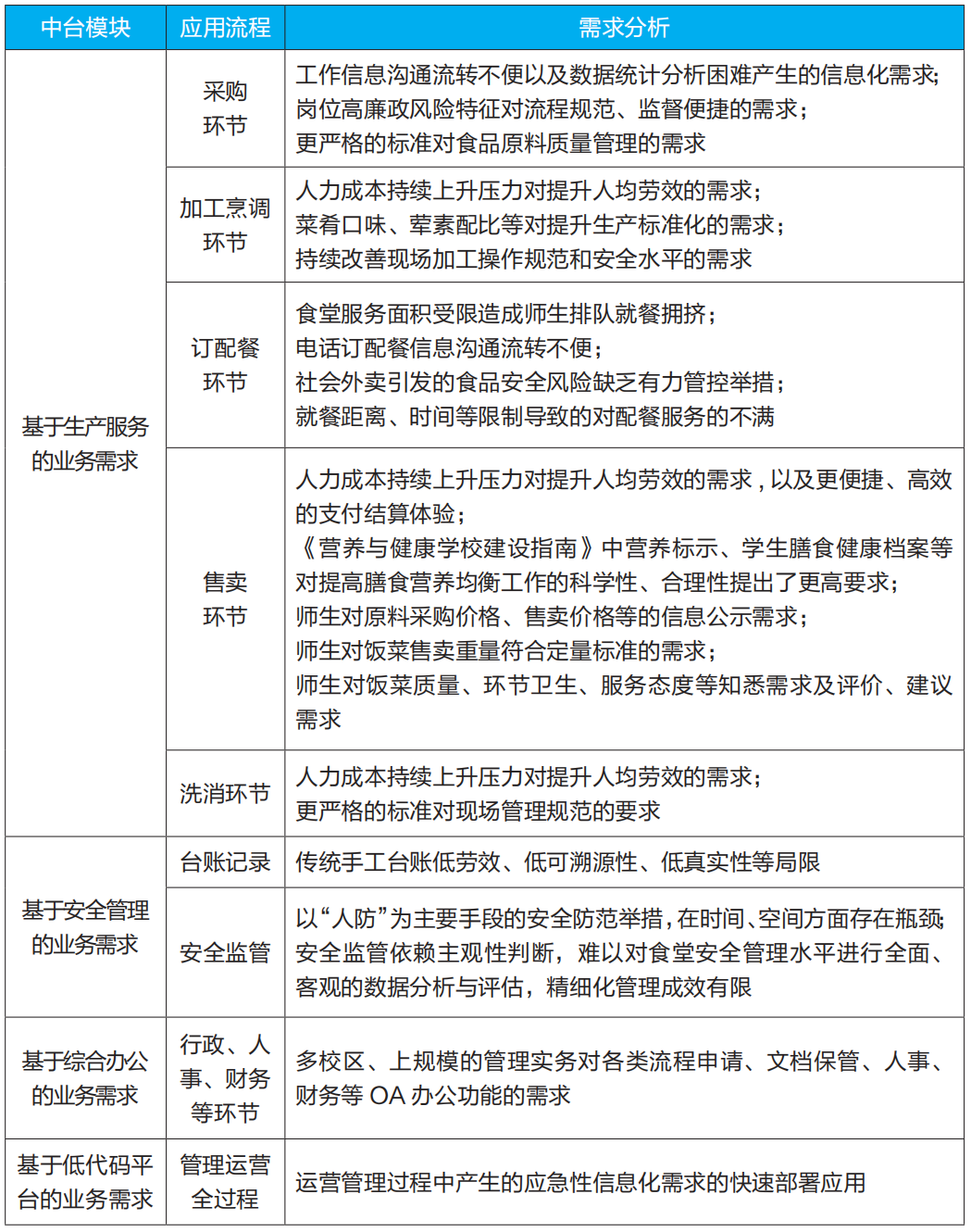 中国科大饮食服务部门基于用户和业务对象逻辑,围绕食堂、安全监管职能部门、行政办公职能部门等用户中心,认为应按照生产服务、安全管理、综合办公、低代码四大模块,对主要业务需求进行划分归类(见表1)。