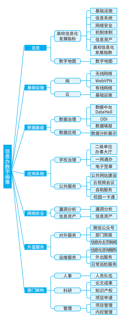 鉴于上述挑战,本文提出构建高校信息化的数字画像,重点关注信息化自身建设情况,通过数据串联业务逻辑实现对信息化建设全过程的动态监测和分析,以有效支撑学校上层应用,提升信息化建设的整体水平,助力高校数字化转型。