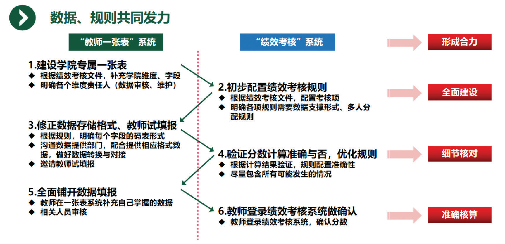 第一步是建设学院专属一张表。由于各学院绩效考核项目有所偏倚,需在原有一张表上,补充学院个性化维度,形成学院专属一张表。其次是配置绩效考核规则,根据各学院的规则在系统上配置分数计算项,数据从一张表关联到绩效考核系统后,即可实现分数的自动计算。第三步是沟通数据提供部门,配合提供相应格式数据,做好数据转换与对接,邀请教师试填报。接下来是与学院秘书协作办公,逐项验证绩效考核规则配置正确与否,沟通优化规则。第五步是制作数据填报指引,引导教师在正确的维度填写个人数据,管理员审核维护并在绩效考核系统中检查教师分数。上述步骤完成后,最后请教师登录绩效考核系统,检查个人分数并确认。