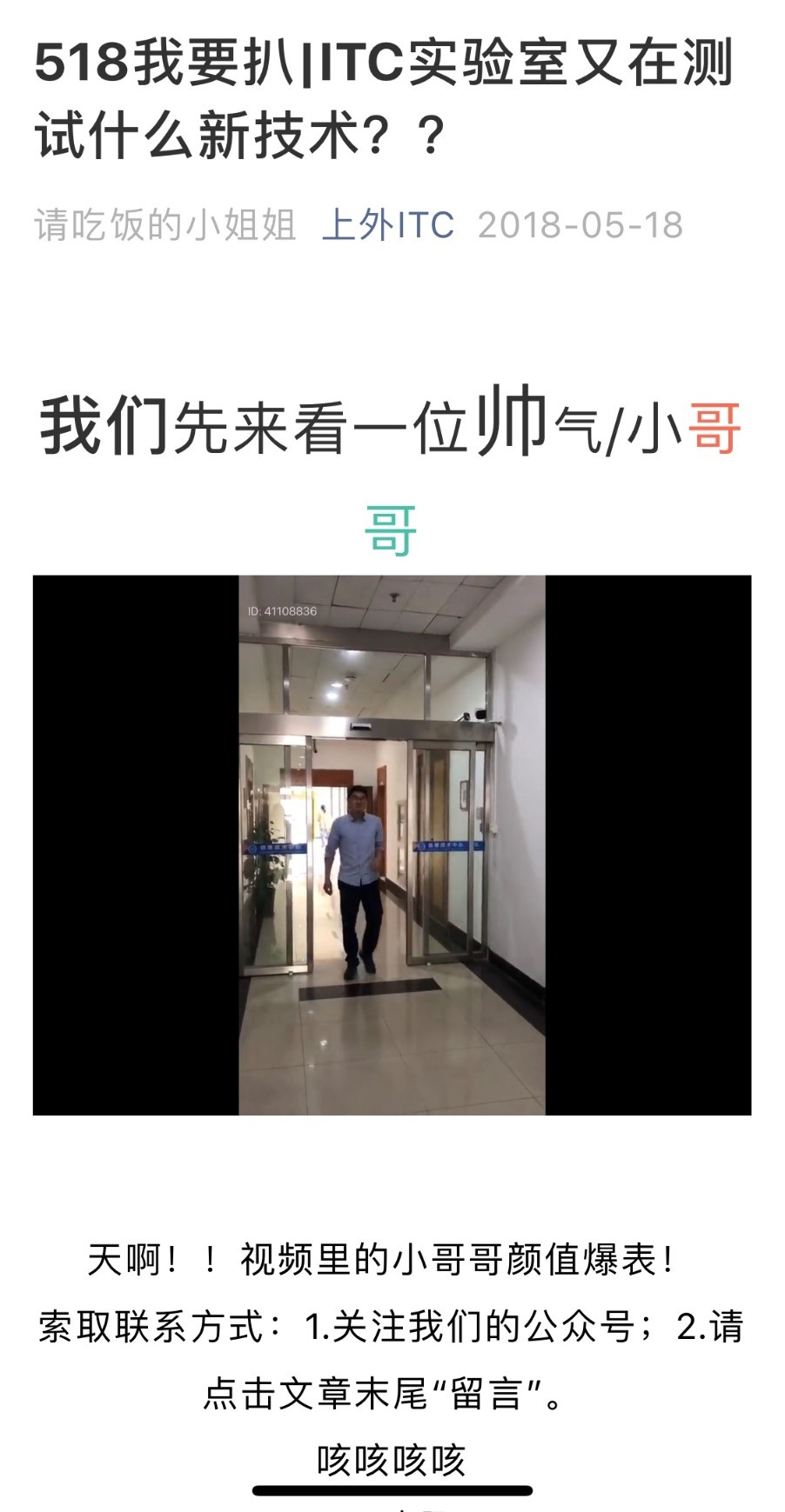 1、第一次做人脸识别门禁系统的推送,找了同事排一个小视频作为开场,把枯燥的技术性文章,以感性的形式切入,使得文章受众面更广。文章设置剧情,同样也很好的地诠释了人脸识别门禁系统“是什么”、“如何用”、“如何便利”、“优劣势”等内容。