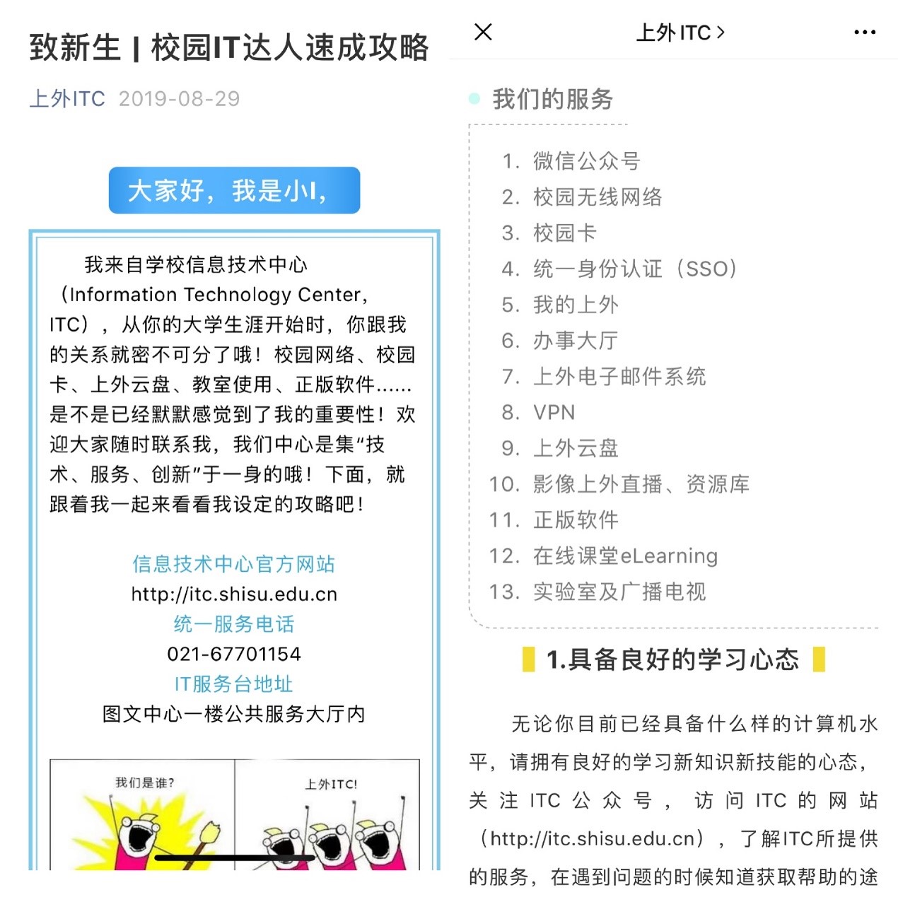 导语:“上外ITC”、“影像上外”两个公众号是上海外国语大学信息技术中心运营的两个主要的微信公众号。这些年来,这两个号发了很多推文宣传、推广学校的IT服务,获得了很大的用户关注度,在学校宣传部定期推出的微信服务号影响力排行榜中经常排在前面。部门并为未设置专门的新媒体运营岗位,作为业余小编我们在日常工作中逐步总结出一些适合学校实际情况的公众号运营经验,利用假期时间分享出来,供高校同行们交流和指正,也作为自我激励。