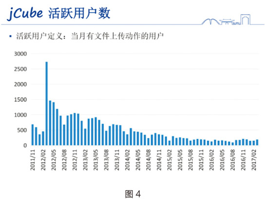 jCube系统于2011年10月部署,2012年3月正式上线。当时的用户容量为教师20GB、学生10GB。但是实际是可以有一些超出的容量。提供的Web、Windows、Android客户端,后台有8台存储服务器,裸容量154TB,已使用43.6%,物理文件数1259万,现在上海交大1/3的师生在用这一服务。如图3。但是,活跃用户数的确也在下降,如图4。