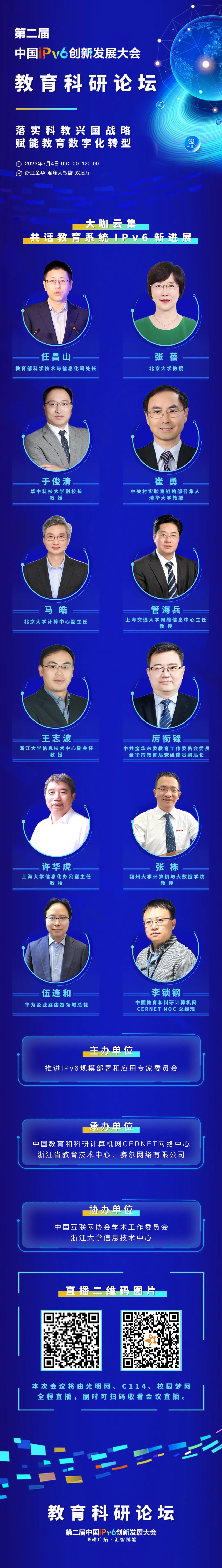其中,为加快推进教育系统IPv6规模部署与应用,由中央网信办等部委指导,推进IPv6规模部署和应用专家委员会主办的教育科研分论坛,定于2023年7月4日上午召开。论坛主题为“落实科教兴国战略,赋能教育数字化转型”,将邀请相关部委领导、高校及科研机构知名专家出席作主题报告,就教育系统IPv6规模部署与应用、IPv6赋能教育数字化转型等进行深入探讨,论坛精彩不容错过!