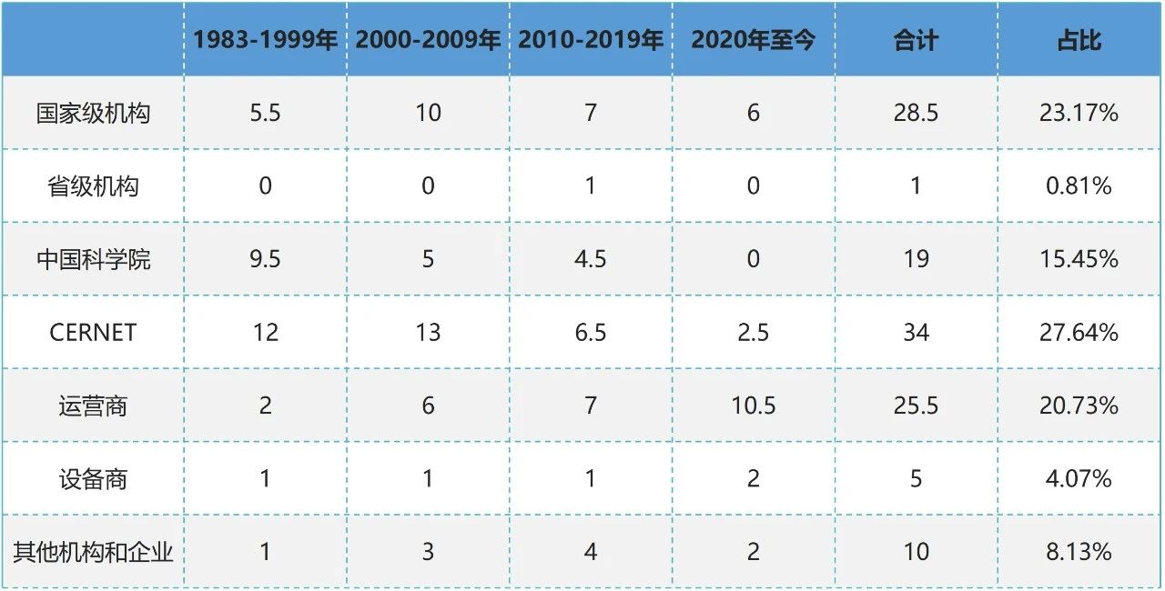表1 中国互联网网络基础技术起源及发展大事记年代数量分布(按贡献单位)