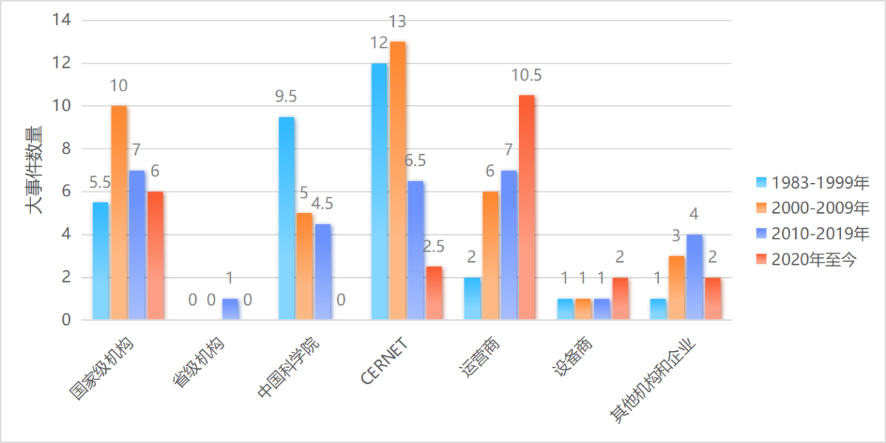 从贡献单位来看,国家级机构28.5项、省级机构1项、中国科学院19项、CERNET 团队34项、运营商25.5项、设备商5项、其他机构和企业10项(计算方式:同一项目数量统计合计为1项,除以合作单位数量的结果为此项得分。如,某一项涉及到两个单位,这两个单位各计算为0.5项。另中国互联网络信息中心CNNIC 2014年前相关事件归类于中科院,2014年后相关事件归类于国家级机构)。