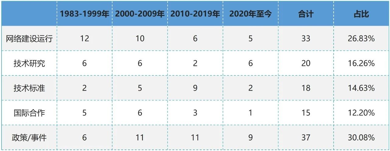 表2 中国互联网网络基础技术起源及发展大事记数量分布(按类别)