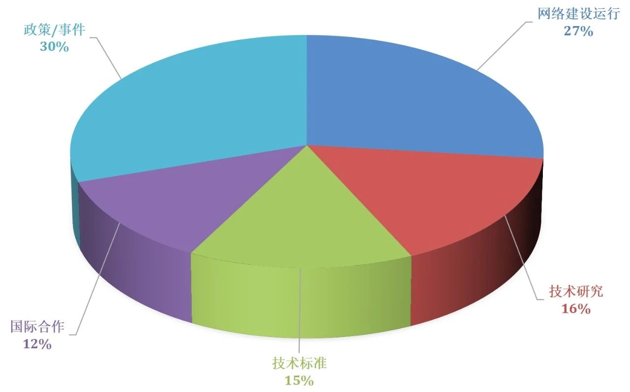 从各大类别来看,网络建设和运行33项、技术研究20项、技术标准18项、国际合作15项、政策/标志性事件37项。