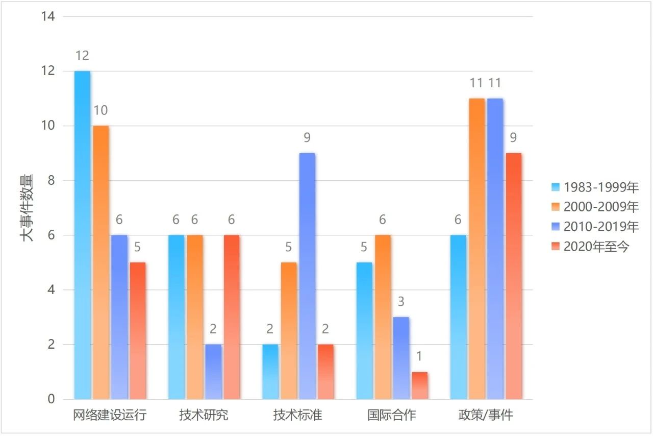 图7 中国互联网网络基础技术起源及发展大事记年代数量分布(CERNET相关)