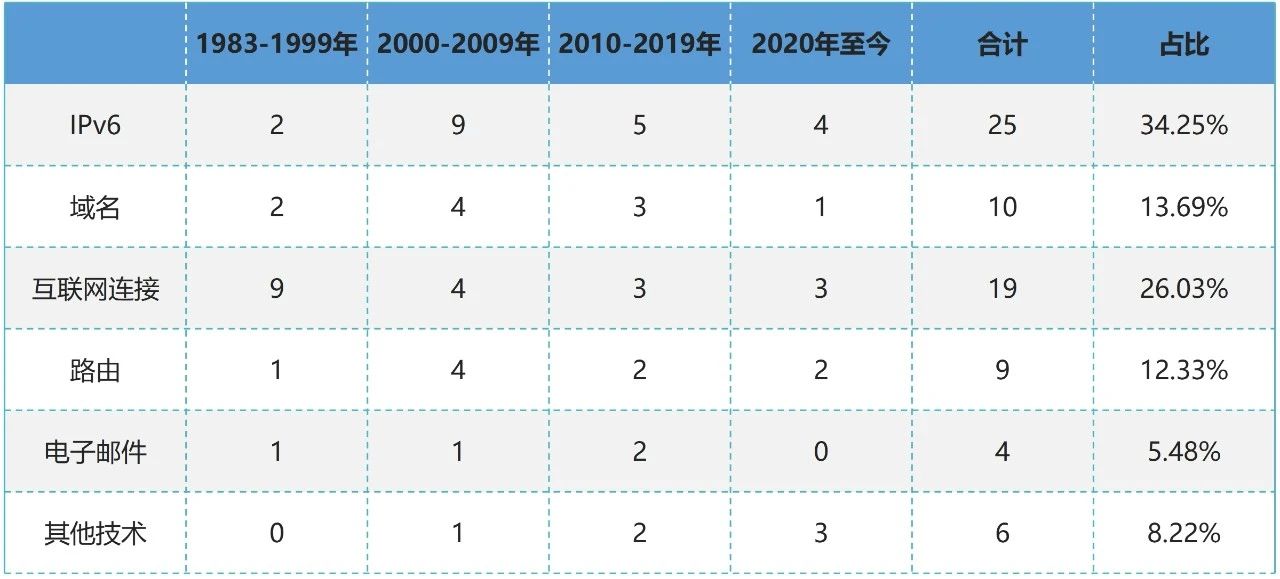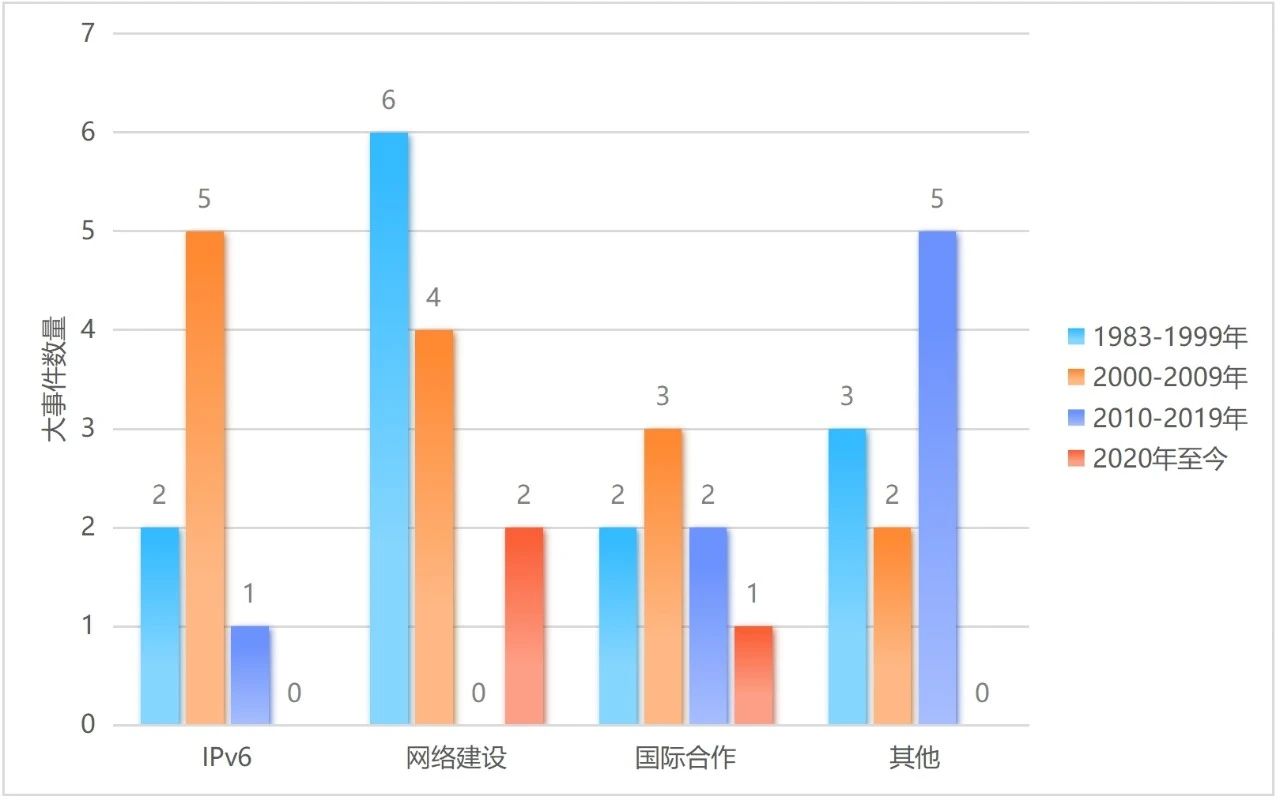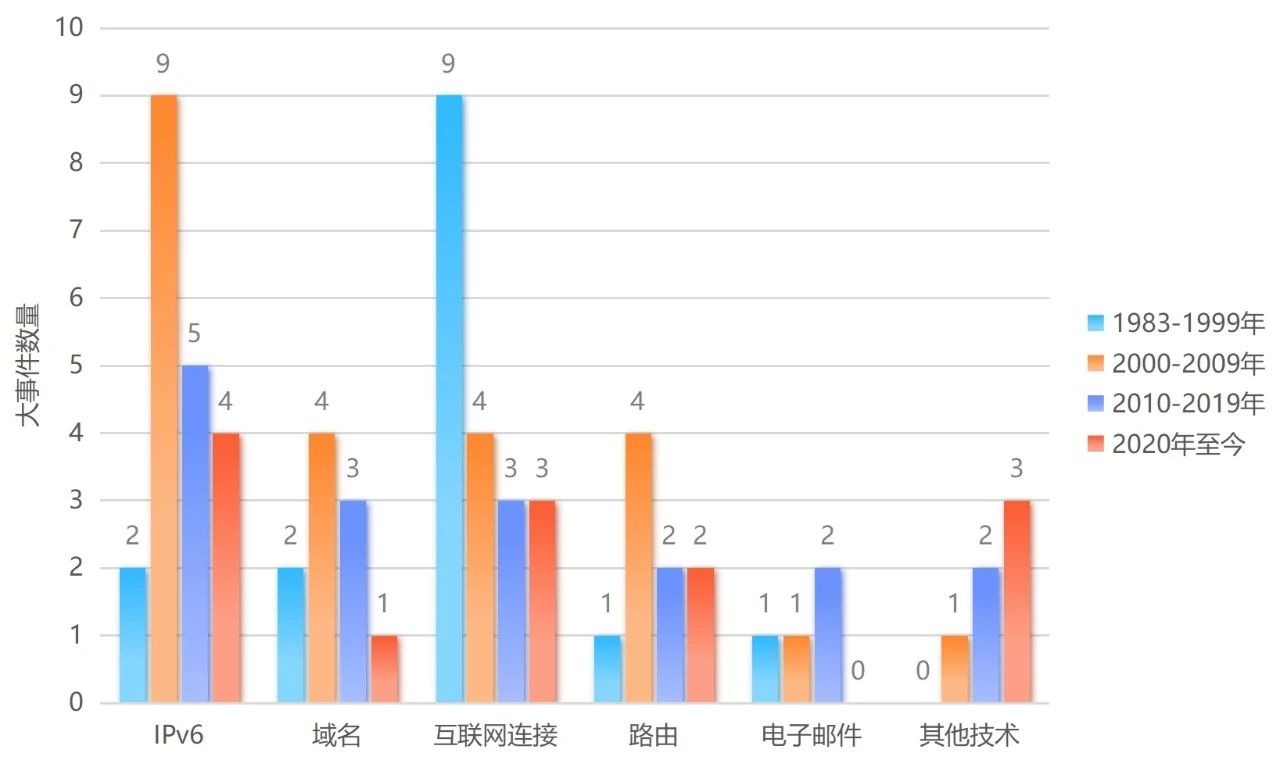 单纯从技术层面(选取与技术相关的73项)来看,IPv6相关大事25项、域名相关10项、互联网连接相关19项、路由相关9项、电子邮件相关4项、其他技术相关6项。