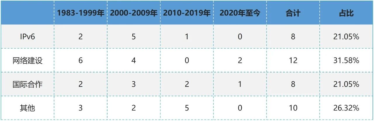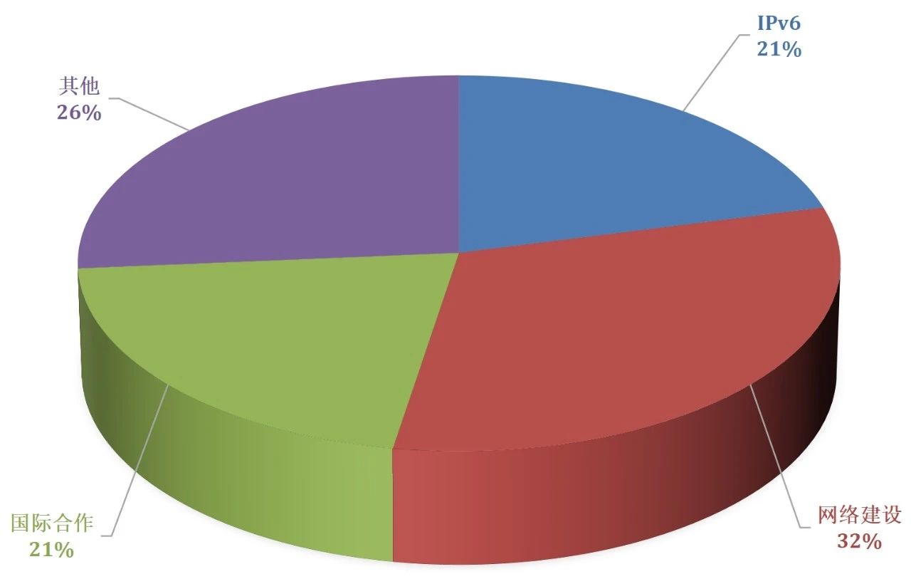 单纯从中国教育和科研计算机网CERNET层面来看,IPv6相关8项、网络建设相关12项、国际合作相关8项、其他相关10项(计算方式:选取与CERNET相关的38项内容,部分内容为与其他合作,在此看作1项)。
