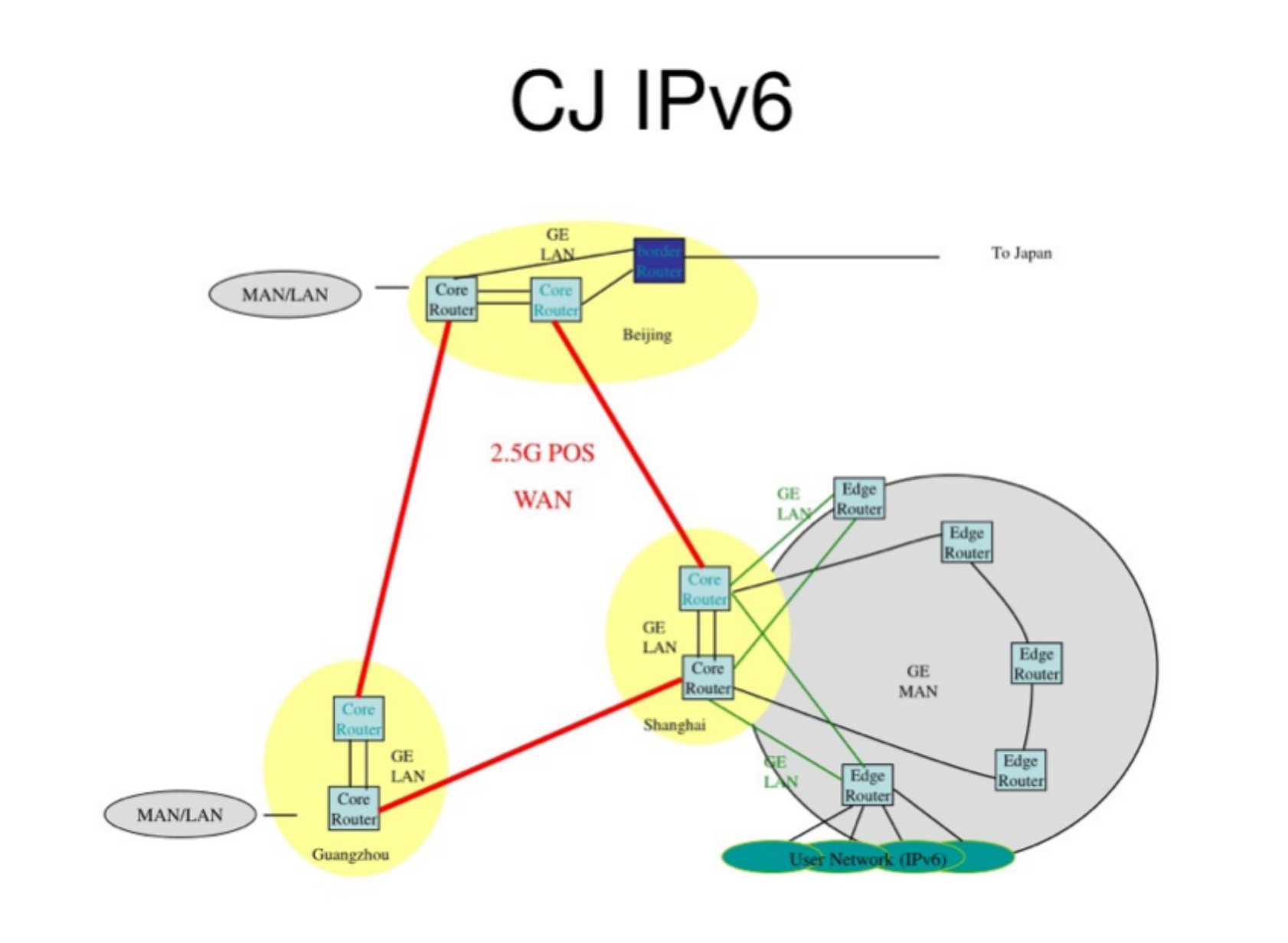 “下一代互联网中日IPv6合作项目”启动,CERNET经国家计委选定为项目的中方实施机构代表,这是我国与国际上合作的第一个下一代互联网项目。2004年,连接北京、上海、广州的中日IPv6主干网开通,用以研究基于IPv6的网络管理等网络关键技术,研究基于IPv6的路由器等网络系统关键技术,开发基于IPv6 的重大应用,制定和形成关于IPv6的相关标准。