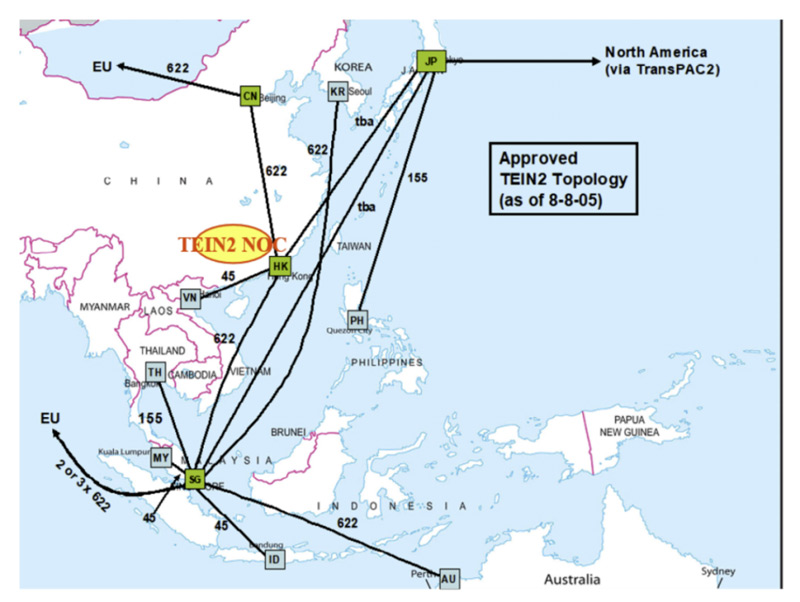 CERNET 网络中心中标欧盟第二代跨欧亚信息网络TEIN2主干网运行管理工作。这是中国的科研管理机构首次被授权管理国际性互联网络,也是国际上对我国管理并运行大规模学术网络能力的肯定,对中国在国际下一代互联研究中占据重要地位起到关键性作用。