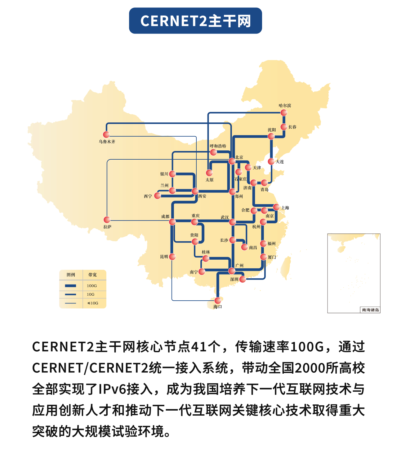 2004年,CERNET2主干网开通,是中国第一个采用纯IPv6技术的下一代互联网主干网,也是全球最大规模的纯IPv6下一代互联网主干网。