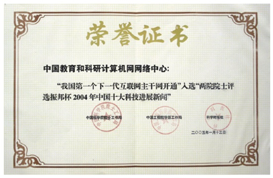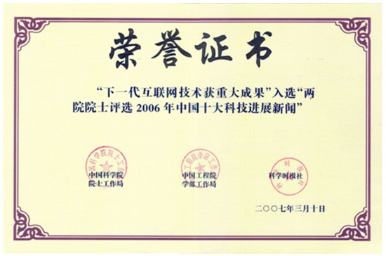 “我国第一个下一代互联网主干网开通”被两院院士评选为2004年中国十大科技进展。2006年,“下一代互联网技术获重大成果”入选中国十大科技进展第一名。2008年,“下一代互联网研究与产业化获得重大突破”入选中国十大科技进展。