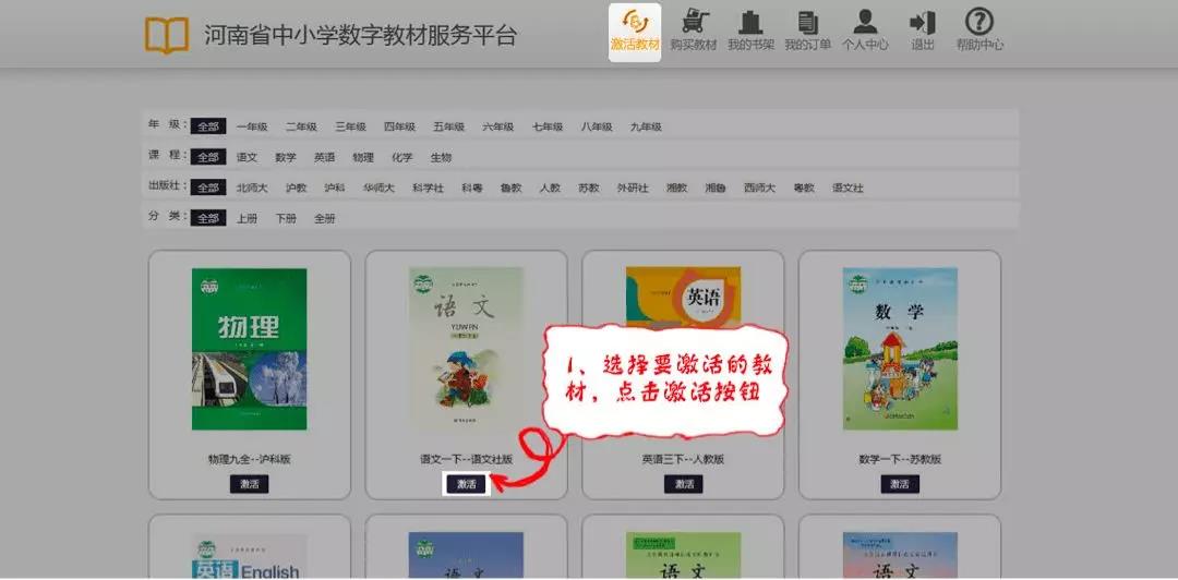 根据年级、课程、出版社、分类选择需要激活的书籍,并点击教材下的“激活”按钮