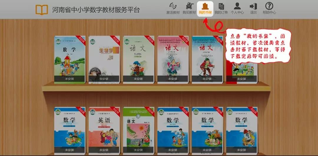 点击顶部菜单栏的“我的书架”,安装教材之后便可使用