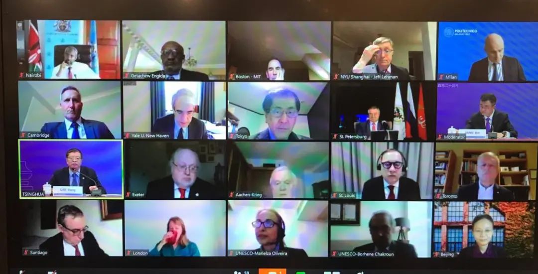 清华大学校长邱勇与耶鲁大学、剑桥大学、帝国理工学院、米兰理工大学、多伦多大学、早稻田大学、圣路易斯华盛顿大学、澳大利亚国立大学、智利大学、埃克塞特大学、马来亚大学、内罗毕大学、圣彼得堡理工大学、麻省理工学院、亚琛工业大学、上海纽约大学、韩国科学技术院、布宜诺斯艾利斯大学、蒙古国立大学、蒙古科技大学等多所高校校长、副校长和专家学者,以及联合国教科文组织多位代表相聚“云端”,共商全球疫情蔓延下的在线教育挑战与变革,共谋交流合作新发展。近百位UNESCO全球代表处官员、国内外专家学者以及媒体代表旁听会议。