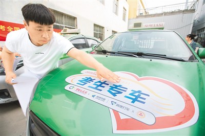 网络出行平台高德打车联合有关方面推出“爱心送考 ”免费服务。图为参与提供服务的工作人员给车贴相关标识。
