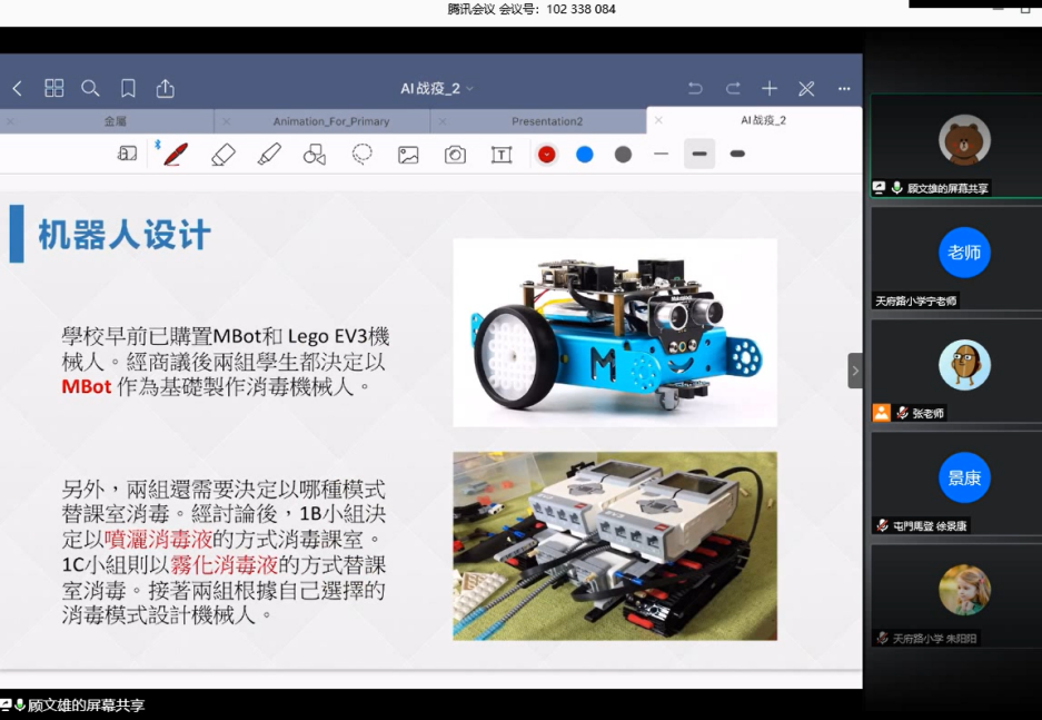 2020年4月,疫情平稳学校面临复学,校园清洁工工作量激增,项目组引导学生从校园的防疫工作开始,用人工智能帮助解决繁重劳动。由广州市天河区天府路小学、深圳市麓城外国语小学和香港明爱马登基金中学三所学校共同开发了《AI战疫情 学英雄——校园智能消毒机器人制作》案例(如图2所示),三校师生相互启发、碰撞灵感,培养了学生的创意和想象力,正确的价值观和态度,以及对国家民族及世界的投入感。