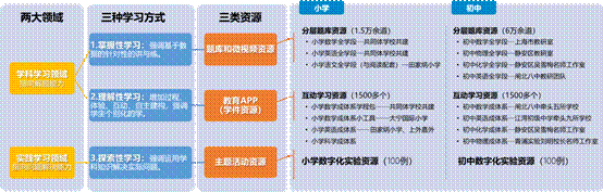 在学科学习领域,小学数学、英语、初中数学、英语、物理、化学等学科形成体系化分层题库和互动学习资源;在实践学习领域,以数字化实验为突破口,开发小学、初中各100例。