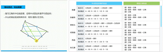 以初中数学《中点四边形》为例,学生拖动四边形的顶点或对角线,观察中点四边形EFGH的形状变化,引导学生探究中点四边形为矩形、菱形、正方形等特殊四边形的条件。在市教研员、复旦大学教授等专家的指导下,增加学生拖动”关键点“数据的采集,即是否按照任务要求,拖动出了特殊四边形及学生的拖动过程、次数等,更直观地反映了学生的思维过程。