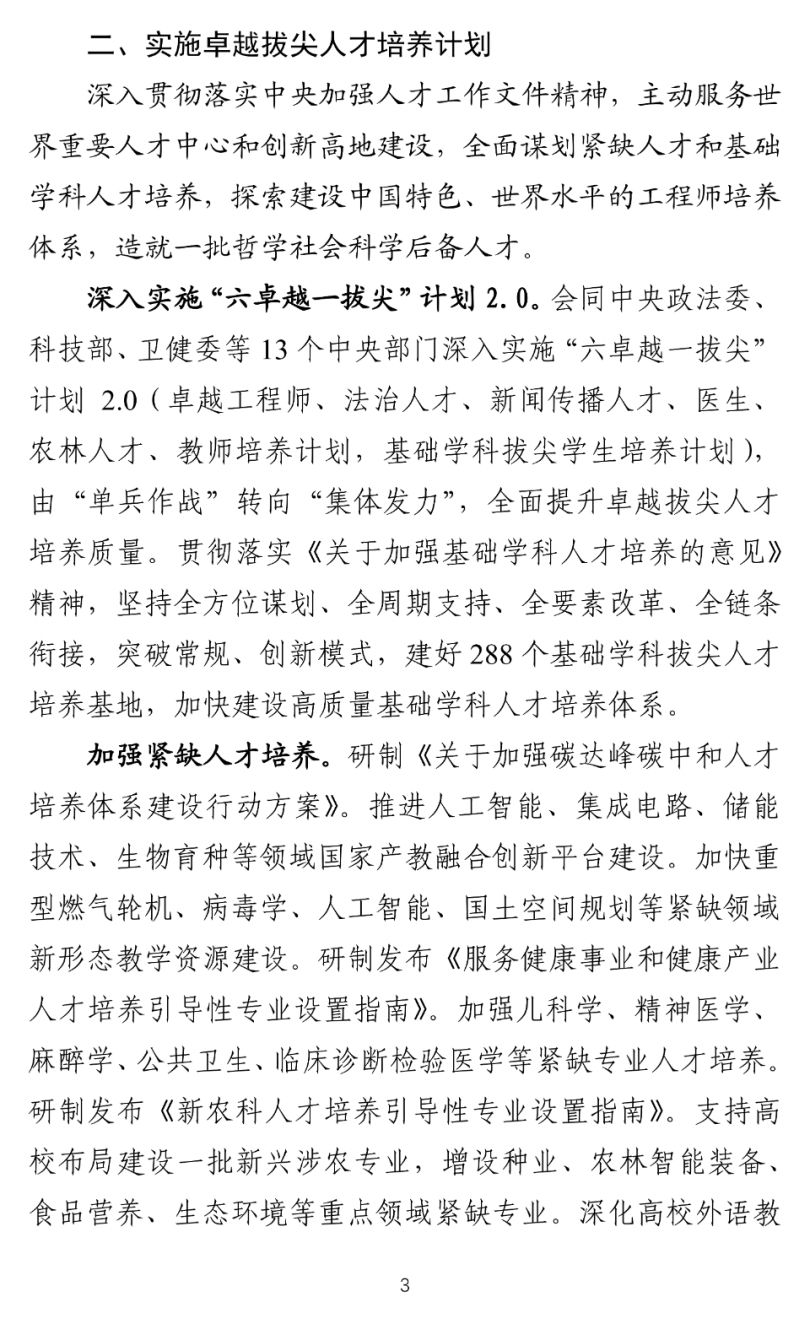 推进人工智能、集成电路、储能技术、生物育种等领域国家产教融合创新平台建设。加快重型燃气轮机、病毒学、人工智能、国土空间规划等紧缺领域新形态教学资源建设。