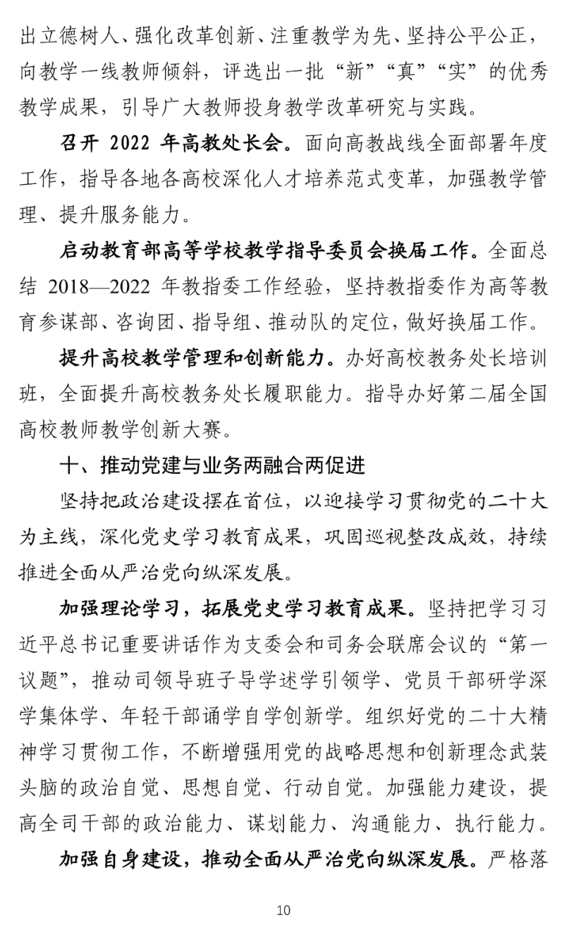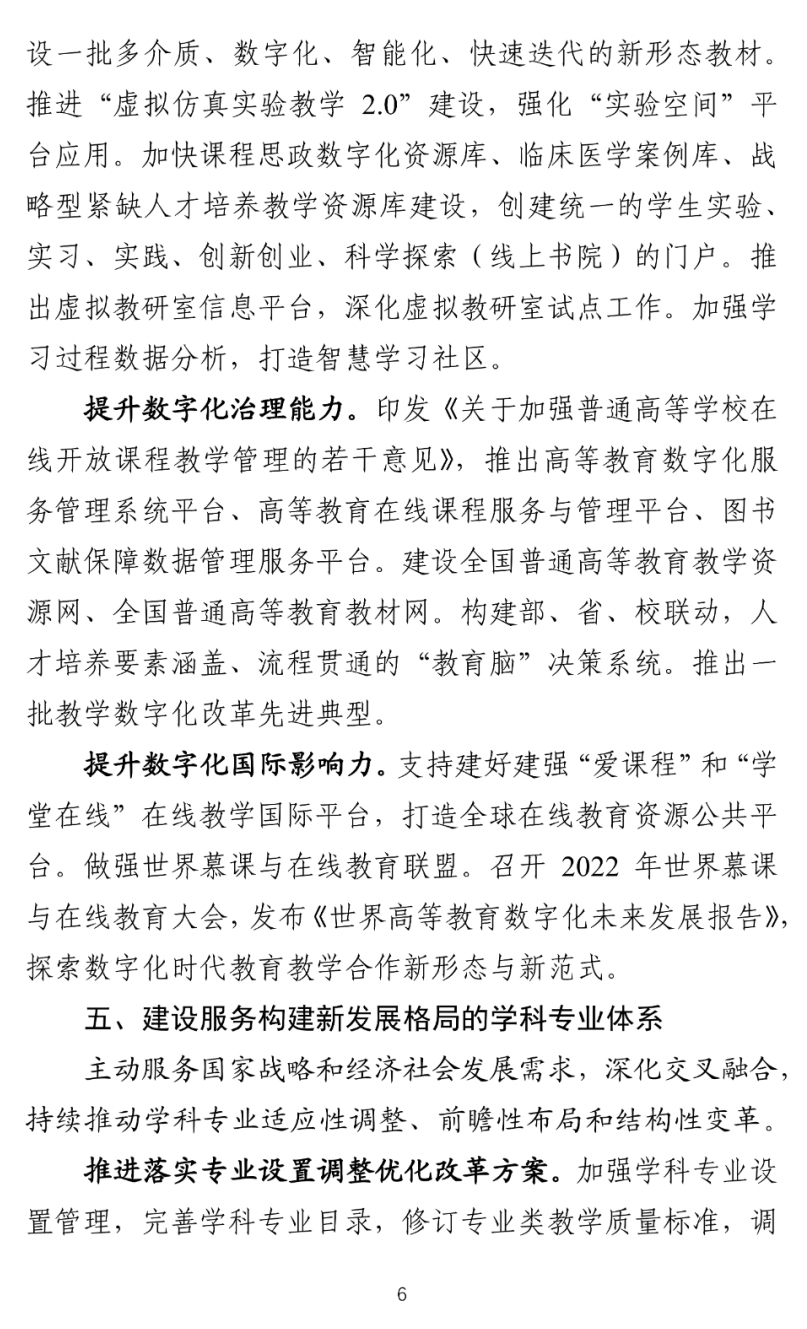提升数字化治理能力。印发《关于加强普通高等学校在线开放课程教学管理的若干意见》,推出高等教育数字化服务管理系统平台、高等教育在线课程服务与管理平台、图书文献保障数据管理服务平台。建设全国普通高等教育教学资源网、全国普通高等教育教材网。构建部、省、校联动,人才培养要素涵盖、流程贯通的“教育脑”决策系统。推出一批教学数字化改革先进典型。