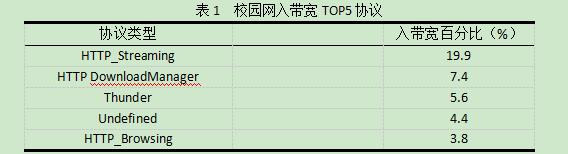 入带宽前5位的网络协议如表1所示,HTTP Streaming、HTTP Download Manager和Thunder协议是构成校园网入流量的主要协议,分别占比19.9%、7.4%和5.6%(Thunder协议已经进行了限速)。