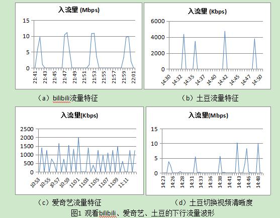 不同在线视频网站呈现的流量特征略有不同,土豆和bilibi的波形更为离散,下载片段时的峰值流量更高,峰值之间的平静期更长,而爱奇艺峰值流量相对较低,几乎不存在峰值之间的平静期,流量波形更接近于锯齿形。