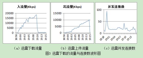 P2P(Peer to Peer)是一种分布式网络,每一个Peer既是服务的使用者,也是服务的提供者。资源的所有权和控制权分散到网络的每一个节点中。服务的使用者和提供者直接进行通信【4】。以迅雷下载为例,在下载的初始阶段,并发连接数迅速达到峰值,随后迅速下降并逐渐稳定,这是因为下载初始建立的大量并发连接中有一部分没有得到响应,还有一部分不是有效连接,传输资源数据的有效连接只占其中一小部分【5】。下载流量逐步增长,直到文件下载结束时,下载流量达到峰值,而上传流量在文件下载结束后继续增长,直到关闭迅雷软件,如图3所示。P2P是一种对称流量,在下载数据的同时,使用相当的带宽上传数据,并且使用向多个IP并发多个连接的方法不断扩展带宽【4】。