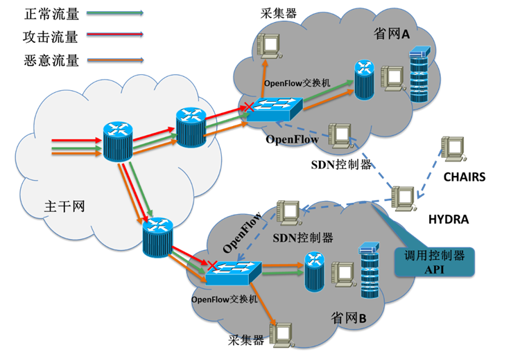 基于上述设想,我们提出通过使用SDN技术设计实现一个入侵阻断系统(HYDRA,HYbrid Detection Response Agent),并在CERNET南京主节点的接入网边界进行了实验部署,实现对江苏省100多所入网高校的DDoS阻断保护和恶意流量样本采集。同时,各校园网可以选择自行部署该系统,提供本校园网内的网络安全事件应急响应能力。