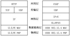 (1)物理层和数据链路层:TCP/IP协议栈采用以太网标准,现在通用的局域网通信标准,要求最大帧长度为1500字节;6LoWPAN协议栈采用IEEE 802.15.4标准,无线连接的个域网通信标准,要求最大帧长度为127字节[[[] 郦亮. IEEE802.15.4标准及其应用[J]. 电子设计应用, 2003(1):14-16.]].