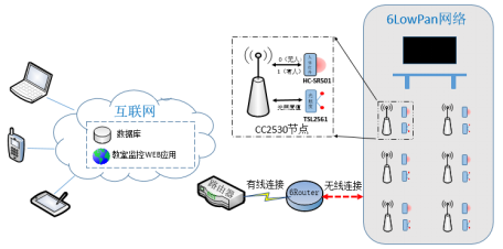 在这样的背景下,2004年11月互联网工程任务组成立了6LoWPAN(IPv6 Low Power Wireless Personal Area Network)工作小组,旨在解决IPv6技术应用于无线传感器网络尚存的难点.研究基于6LoWPAN的教室监控系统具有很强的理论价值和实际意义,响应国家“节能减排”号召的同时,也为下一代互联网大规模部署IPv6技术奠定基础.
