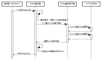 浏览器支持HTTP协议,对于客户端发出的HTTP请求,浏览器会解析成请求头、请求体的形式,对于服务器返回的HTTP响应,浏览器会解析成响应头、响应体的形式.但是,当前的浏览器都不支持COAP协议,因此,在网址栏输入coap://localhost:5683,浏览器是不解析的.实现教室监控系统的关键就是处理COAP请求和COAP响应,Node.js支持COAP,可以将COAP请求响应封装在服务器里面,需要访问传感器节点时,在其请求处理函数里面发送COAP请求,访问传感器节点,并接收返回的COAP响应.具体处理过程如图6,从图中可以看出,COAP请求是由服务器代为发出的,COAP响应也由服务器接收并解析,COAP协议层对用户来说是透明的,用户只需要发送普通的http请求就可以访问6lowpan网络资源,这样就解决了浏览器不支持COAP协议的问题.
