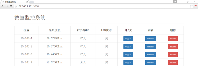 教室监控系统效果展示如图7所示,实现了发送Get请求获取传感器节点资源,包括光照度资源以及红外感应结果.系统可以发送Post请求控制传感器节点资源,可控制照明灯的亮灭.还可以在后台新增传感器节点的放置位置、IPv6地址、MAC地址、映射的端口号、服务类型等信息向数据库注册,对节点执行增、删、改、查操作.