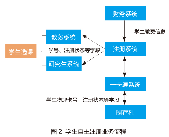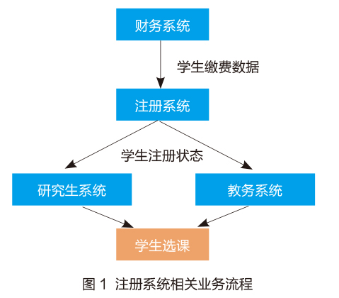 注册系统主要是管理学生注册报到的重要业务系统。学生注册报到是指学生在每学期开学之初进行的工作,来标记该学生已经到学校报到,并进行下一步的学习生活。如图1所示,给出了与注册系统有关联的业务流程情况。首先,将财务系统中学生缴费情况数据传送到注册系统;其次,注册系统根据学生缴费情况对学生进行注册管理(已缴费学生正常注册,未缴费学生提示先缴费后注册);再次,将学生注册状态依据学生类别分别发送到研究生系统和教务系统;最后,研究生系统和教务系统依据学生注册情况分别控制研究生和本科生选课等工作。传统的注册系统是基于上述业务流程,通过管理学生注册来获取学生在校注册状态数据,并为相关联业务系统提供数据支持。
