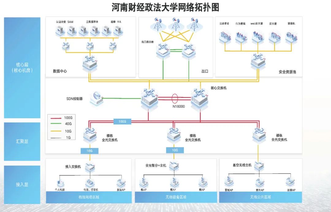 河南财经政法大学当前有近3万名在校师生,在此次校园网升级改造前已通过有线网络实现了新校区的全覆盖,无线网络实现了学校宿舍及部分公共区域的覆盖。校内师生以及工作人员能够通过多种终端在任意时间,任意地点访问网络资源。