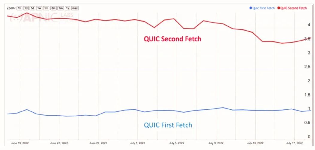 这里存在的问题是,第二次请求QUIC(QUIC Second Fetch)的比例实在过低(3%~4%)。谷歌曾宣布,Chrome浏览器在2020年10月会增加对QUIC的支持,通过使用Alt-Svc指令来触发QUIC。Cloudflare的观测报告显示,30%的HTTP请求使用了QUIC。尽管我们不清楚该报告中的比例指的是流量数还是会话数,但无论是哪种情况,30%的QUIC使用量都比3%~4%要多。